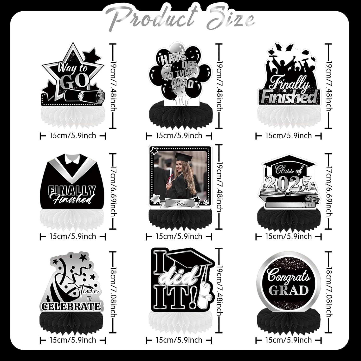 UUBAO 9 PCS Custom Graduation Party Honeycomb Centerpieces Class of 2025 Congrats Grad Decorations Congratulate Graduation Table Toppers for Graduation Party Favor Supplies (Black and Silver)