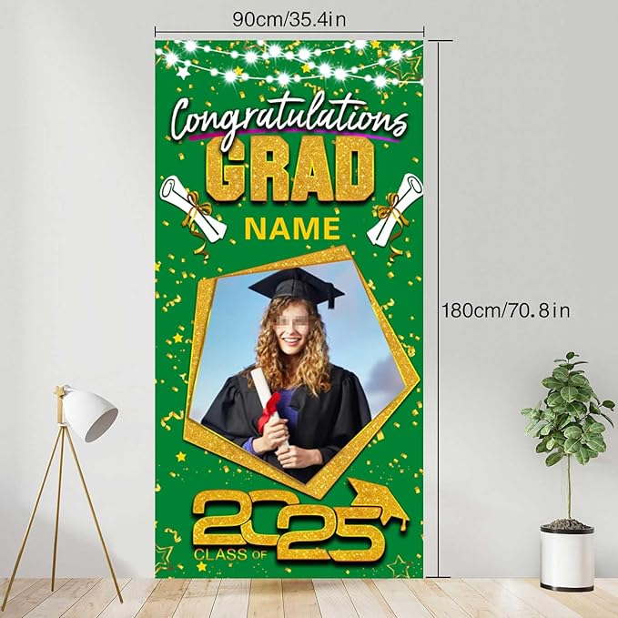 【Customize】Upload your favorite photos and preview the designs. Celebrate your graduation with our brand new 2025 Graduation door banner,add atmosphere to your graduation party.Featuring customizable size, photo and name for a truly personal touch.Just start from "customize now" on top button.