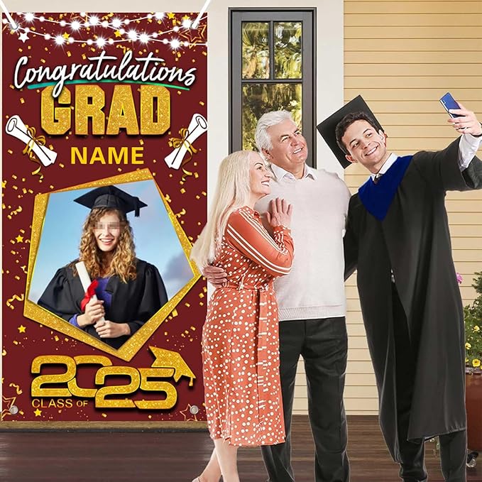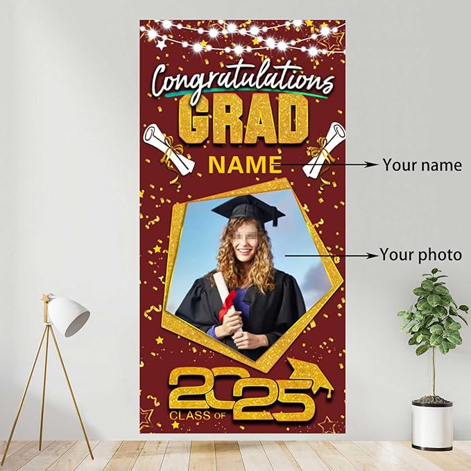 【Customize】Upload your favorite photos and preview the designs. Celebrate your graduation with our brand new 2025 Graduation door banner,add atmosphere to your graduation party.Featuring customizable size, photo and name for a truly personal touch.Just start from "customize now" on top button.