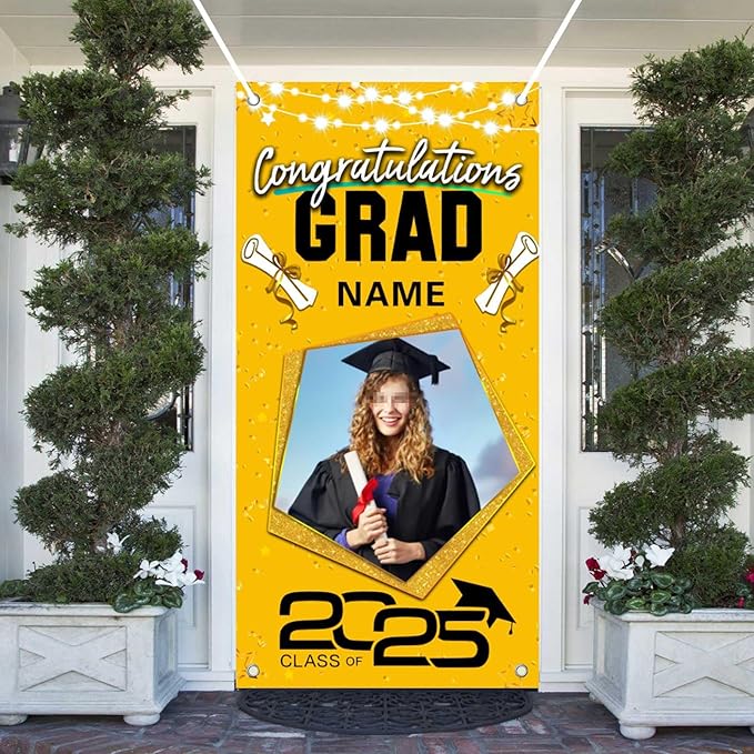 【Customize】Upload your favorite photos and preview the designs. Celebrate your graduation with our brand new 2025 Graduation door banner,add atmosphere to your graduation party.Featuring customizable size, photo and name for a truly personal touch.Just start from "customize now" on top button.