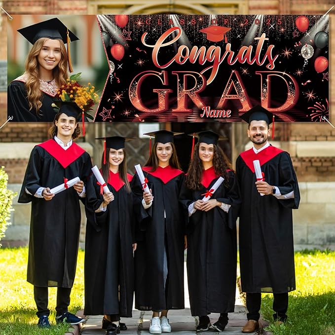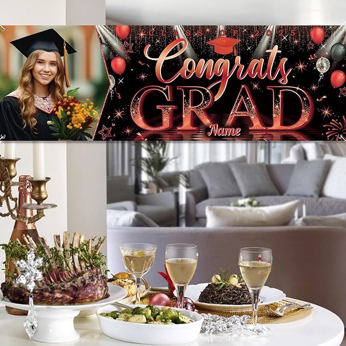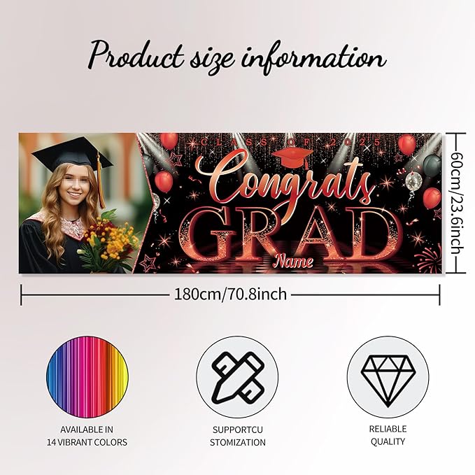 【Customize】Upload your favorite photos and preview the designs. Celebrate your graduation with our brand new 2025 Graduation door banner,add atmosphere to your graduation party.Featuring customizable size, photo and name for a truly personal touch.Just start from "customize now" on top button.