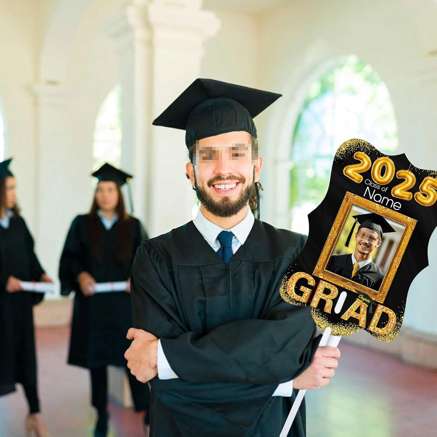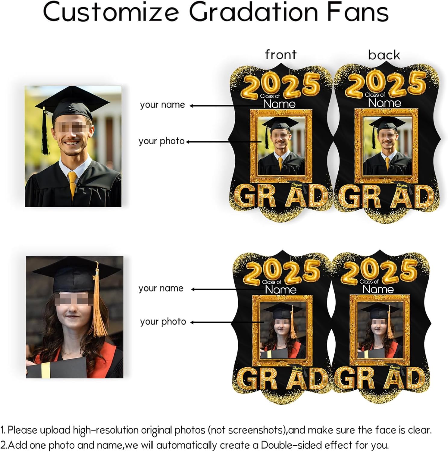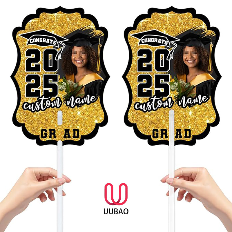 UUBAO Personalized Graduation Double Sided Face Fan Class of 2025 Customized Graduation Head Face Cutout with Handle Fun Photo Prop Supplies(Black and Gold)