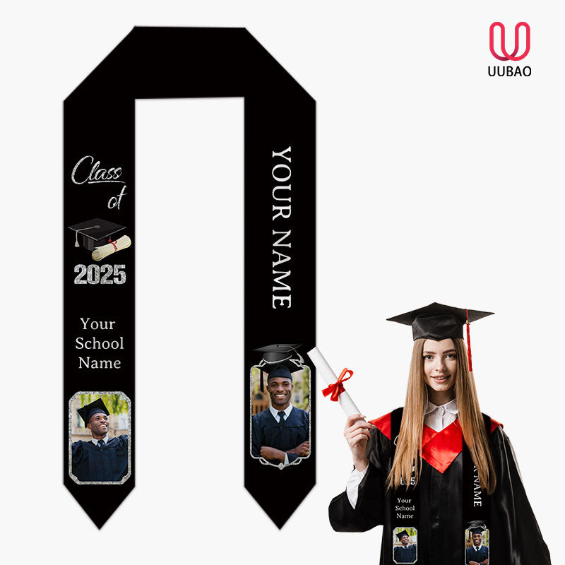 UUBAO Personalized Graduation Stole Class of 2025 Custom Academic Ceremony Shawl for Graduations Formal Events(Black and Silvery)