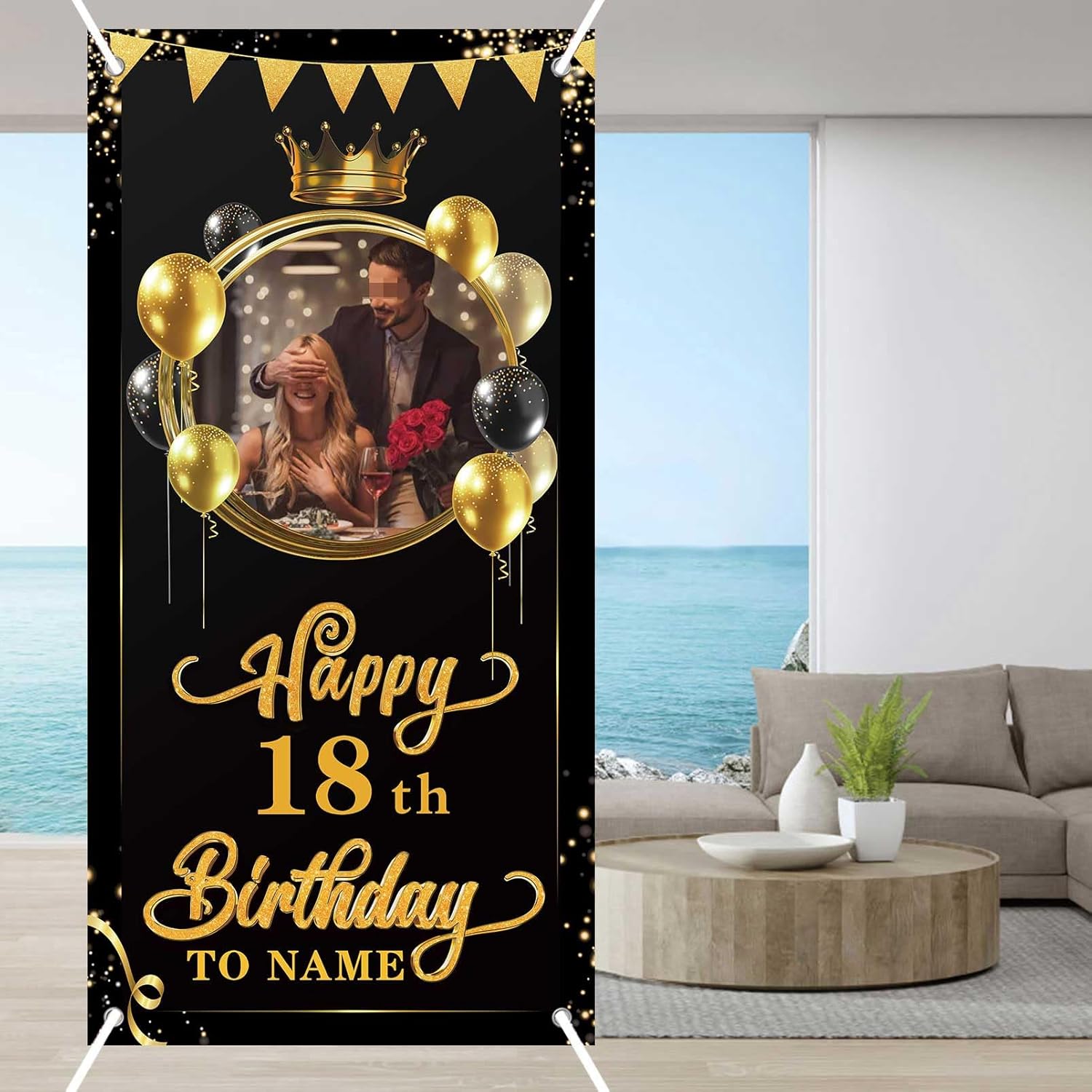 UUBAO Custom Happy Birthday Door Banner Backdrop Birthday Decorations Party Supplies for Women Men(Black and Gold)