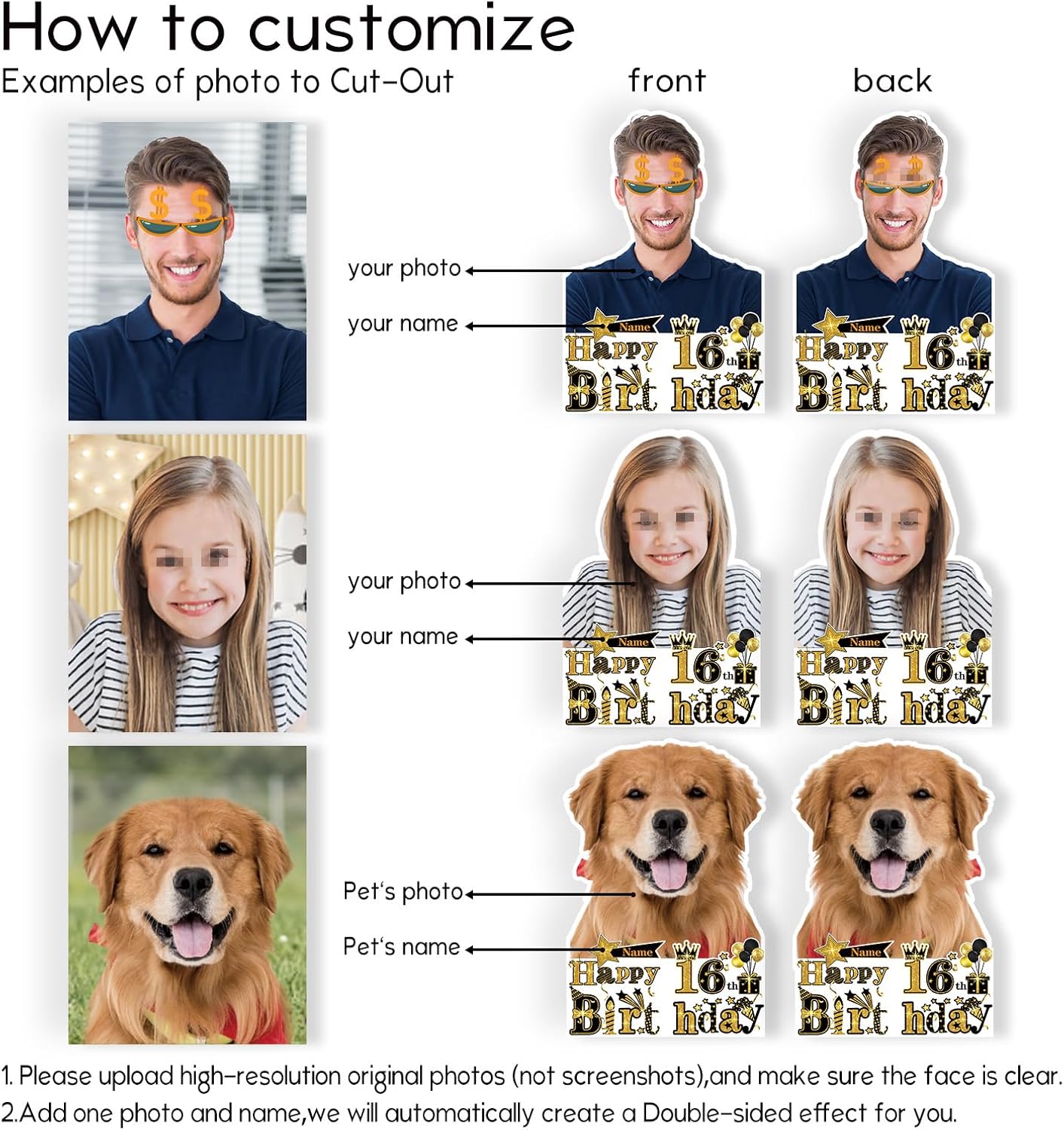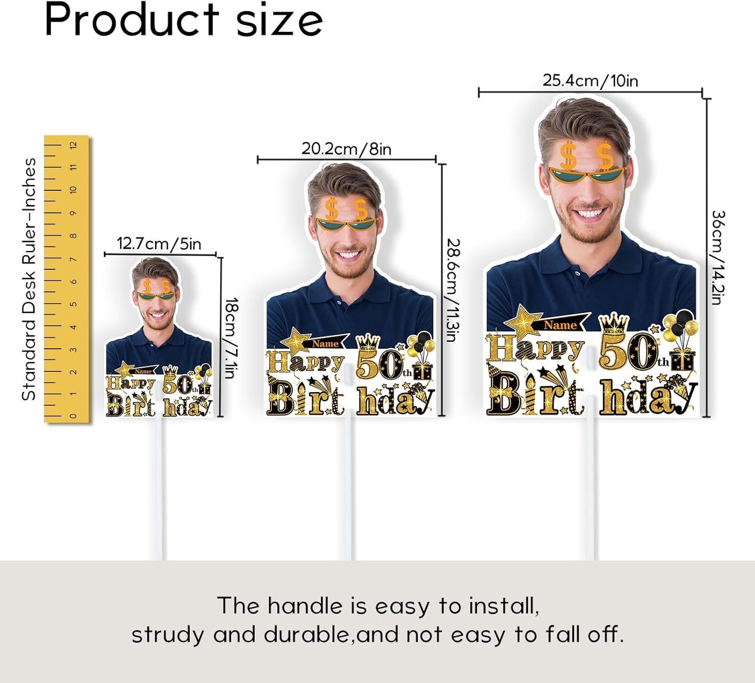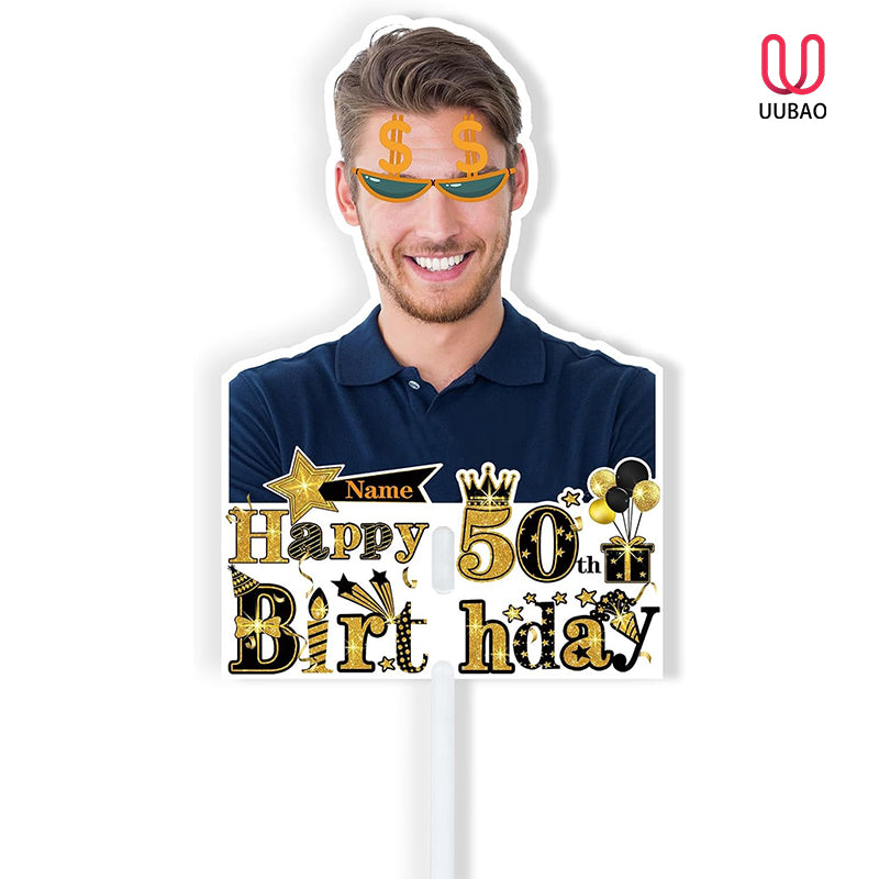 UUBAO Personalized Double Sided Happy Birthday Photo Prop Face Fan Customized Birthday Fun Supplies(Black and Gold)